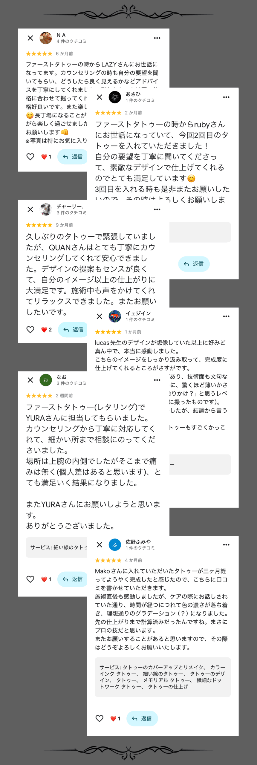 特に初めてタトゥーを入れる方、値段問わず高いクオリティのタトゥーを入れたい方には必見の内容となっております。